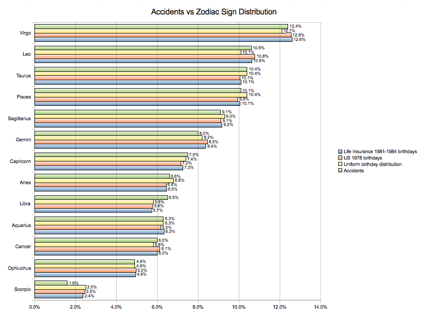 Last week, Allstate insurance published a press release, with a graph displaying the number of accidents in 2010, grouped and sorted by Zodiac sign. The data was based on the actual birthdays of customers. At first glance, one would be surprised to find that Virgos have a much worse driving record (8 times as many accidents!) than Scorpios. Astrologists and the superstitious would actually expect a lower accident rate for Virgos, known as perfectionists. On the other hand, "compulsive and obsessive" Scorpios would be expected to speed and exhibit risky behavior including tailgating and frequent lane-changing, leading them to a higher accident rate. Rational people would also be surprised at the results, expecting a uniform distribution of accident rates, with no dependency on Zodiac signs.